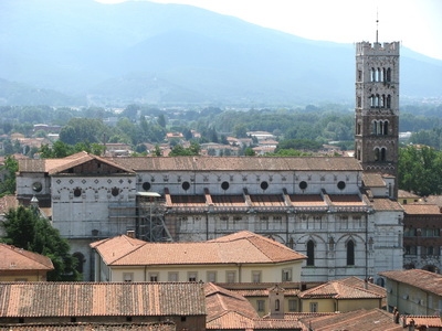 una sosta “obbligata” per la presenza al suo interno del “Volto Santo”, vedi sotto. Esternamente si presenta con una bella facciata di marmo risalente al XIII secolo, con influenze pisane, con loggette e ricca di colonnine multiforme.