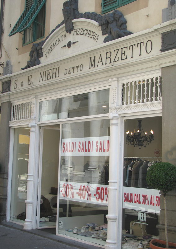 A Lucca ci sono diversi negozi con insegne commerciali del tempo che fu che adesso hanno cambiato tipologia di merce venduta, mantenendo la vecchia insegna e vetrina.